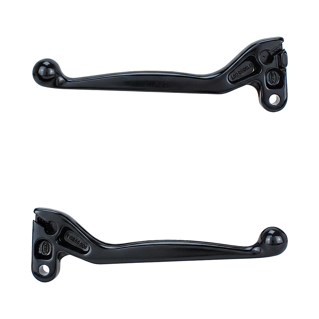 Satz Aluminiumhebel (Bremse und Kupplung) in schwarz eloxierter Ausführung vom deutschen Vertriebspartner MZA. Die Hebel sind für Simson-Motorräder konzipiert und stellen einen stilvollen Ersatz für die Originalteile dar.