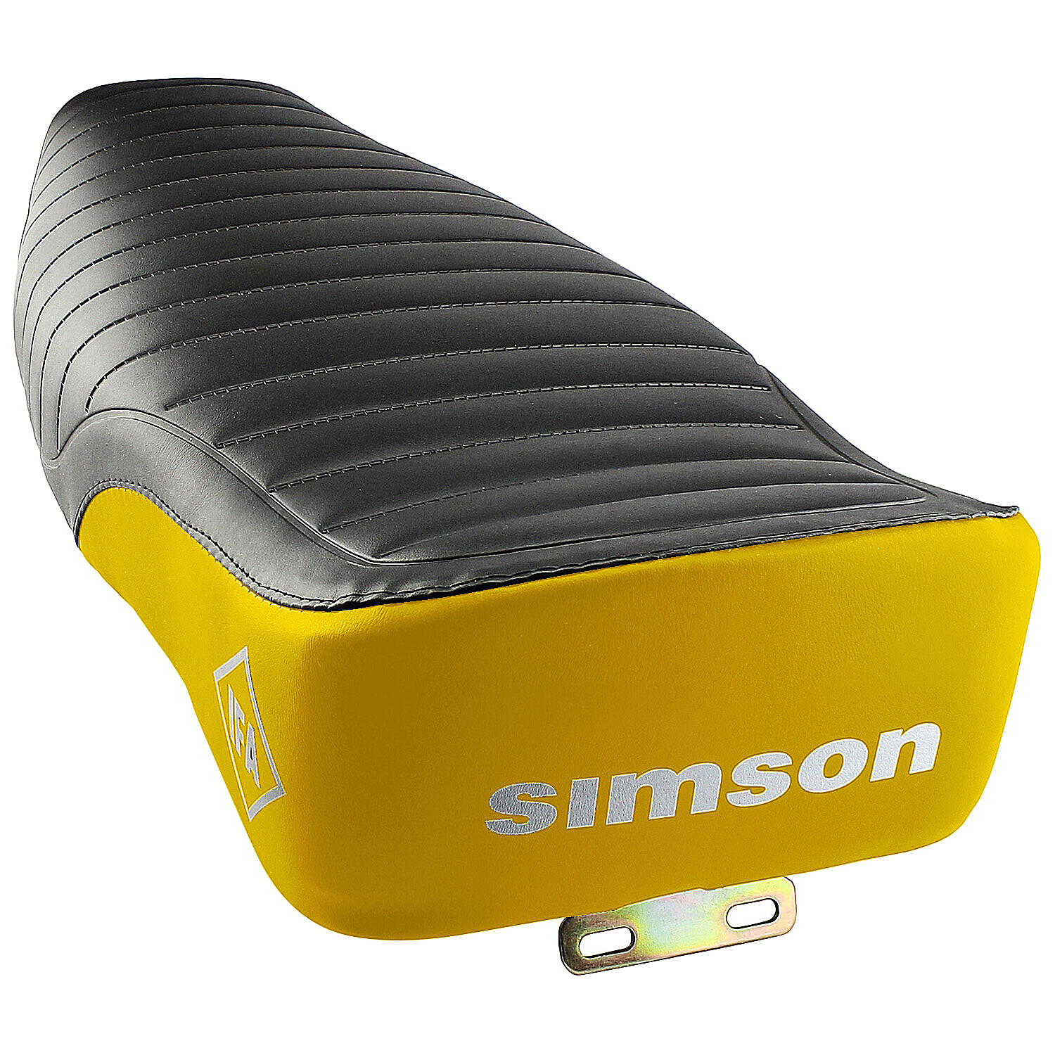 Komplettsitzbank für Simson-Motorräder in schwarz-gelber Ausführung mit IFA-Logo an den Seiten und Simson-Schriftzug im hinteren Bereich. Der Sitzbezug ist im oberen Bereich mit rutschhemmender Rippenstruktur versehen, das Sitzbankblech ist galvanisch verzinkt. Obwohl die Variante Elektronik original eine glatte Oberfläche hatte, kann diese Sitzbank auch für dieses Modell verwendet werden.