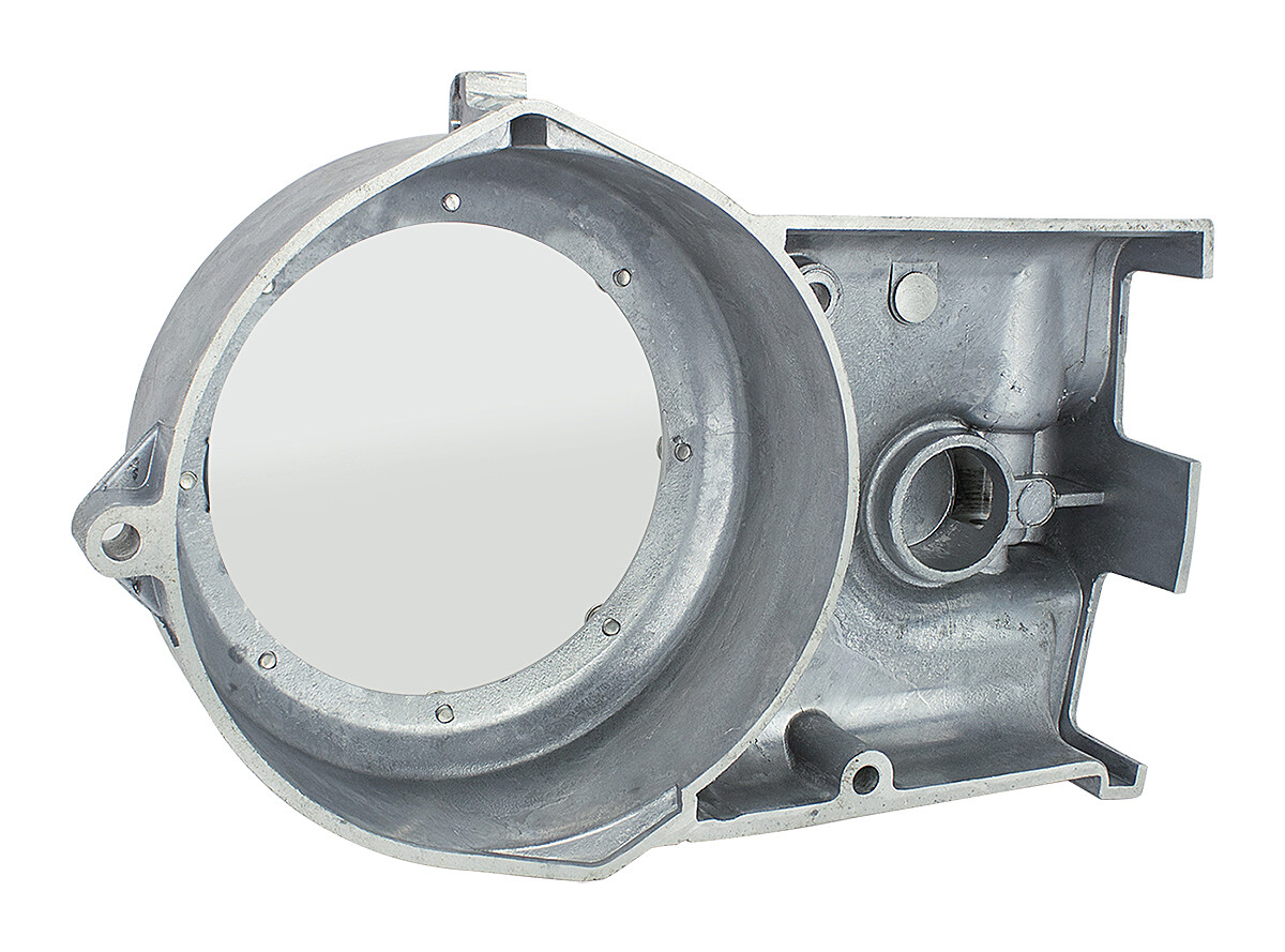 Rechtes Aluminium-Motordeckel für Simson-Motoren, ausgestattet mit einem Schauglas zur Kontrolle der Rotorfunktion.