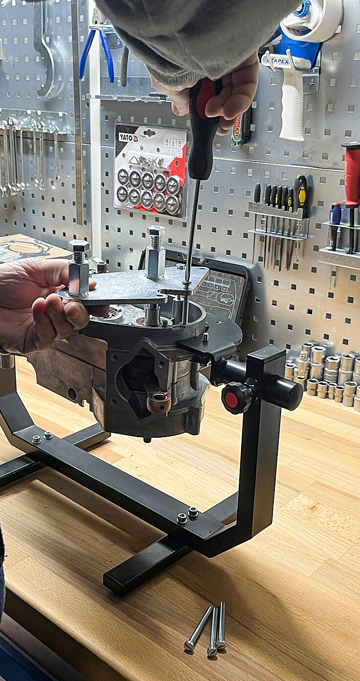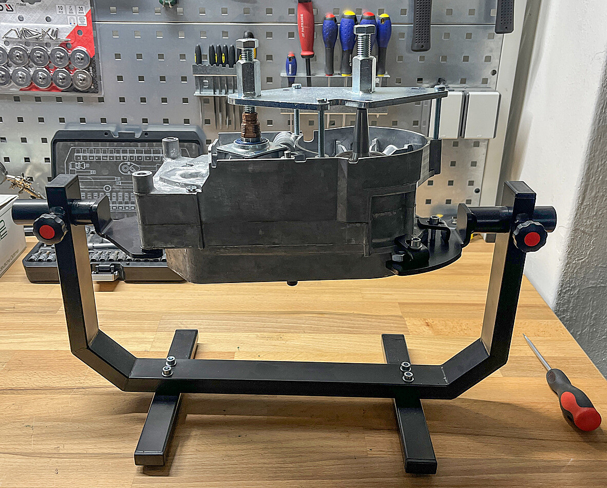 Vorrichtung zum Trennen der Motorgehäusehälften ermöglicht eine schonende Demontage des Motorgehäuses sowie das sichere Auspressen der Kurbelwelle von beiden Seiten der Gehäusehälften. Die Konstruktion der Vorrichtung eliminiert die Notwendigkeit von Hammerschlägen und schützt dadurch Gewinde, Zapfen und Dichtflächen des Motors vor mechanischen Beschädigungen oder Verformungen.